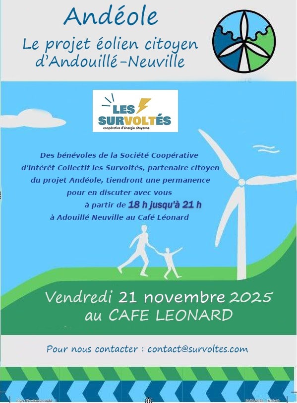 Les bénévoles de la SCIC Les Survoltés, partenaire citoyen du projet Andéole, tiendront une permanence pour échanger avec le public et répondre à toutes vos questions. 📆 Vendredi 21 novembre 2025⏰ À partir de 18h30📍 Café Léonard, Andouillé-Neuville Venez rencontrer les bénévoles et en savoir plus sur ce projet éolien citoyen !