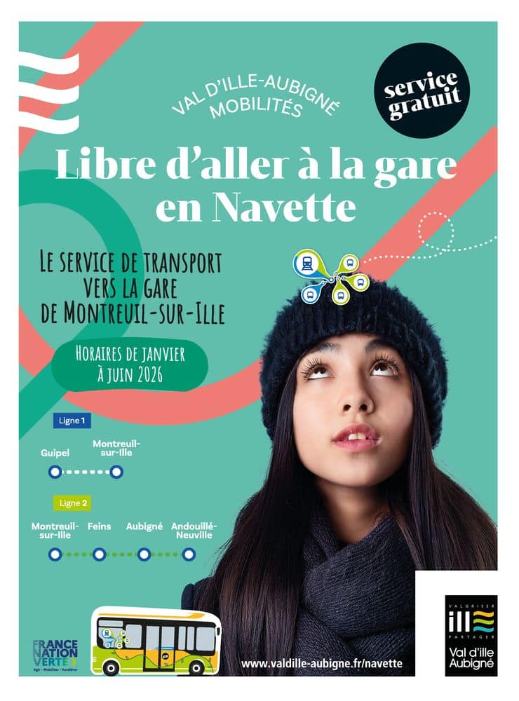 À compter du 5 janvier 2026, La Navette adopte de nouveaux horaires, coordonnés avec les passages des trains en direction de Rennes et de Saint-Malo. Gratuite et ouverte à toutes et tous, La Navette facilite les déplacements du quotidien vers la gare de Montreuil-sur-Ille. Le service fonctionne chaque semaine et dessert les communes d’Andouillé-Neuville, Aubigné,...