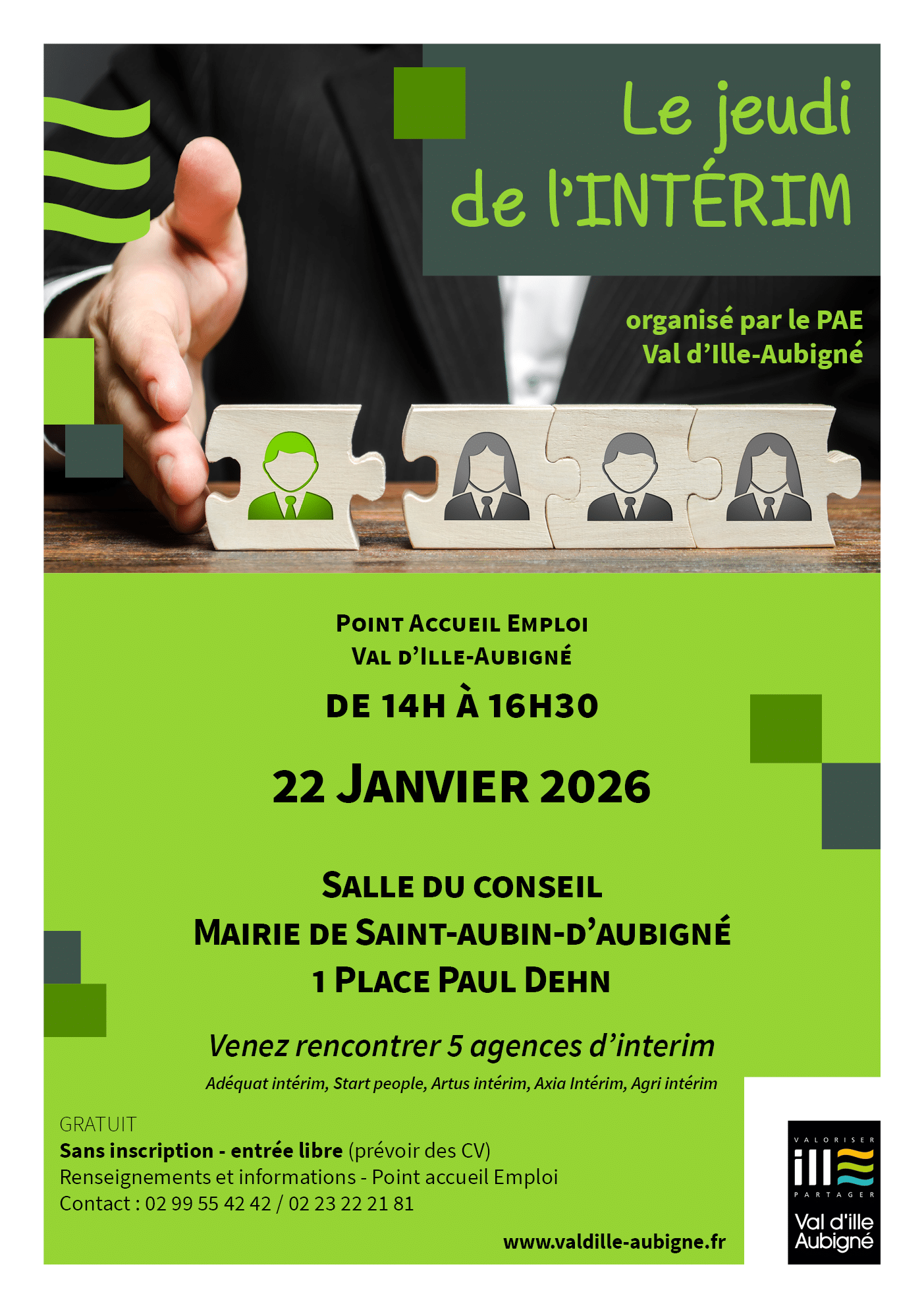 Le jeudi 22 janvier, de 14h à 16h30, le PAE de Saint-Aubin-d’Aubigné ouvre ses portes à 5 agences d’intérim proposant leurs offres d’emploi. Cette rencontre est ouverte à tous et ne nécessite ni inscription ni rendez-vous. Il vous suffit de vous présenter avec votre CV pour échanger directement avec les recruteurs et découvrir de nouvelles...