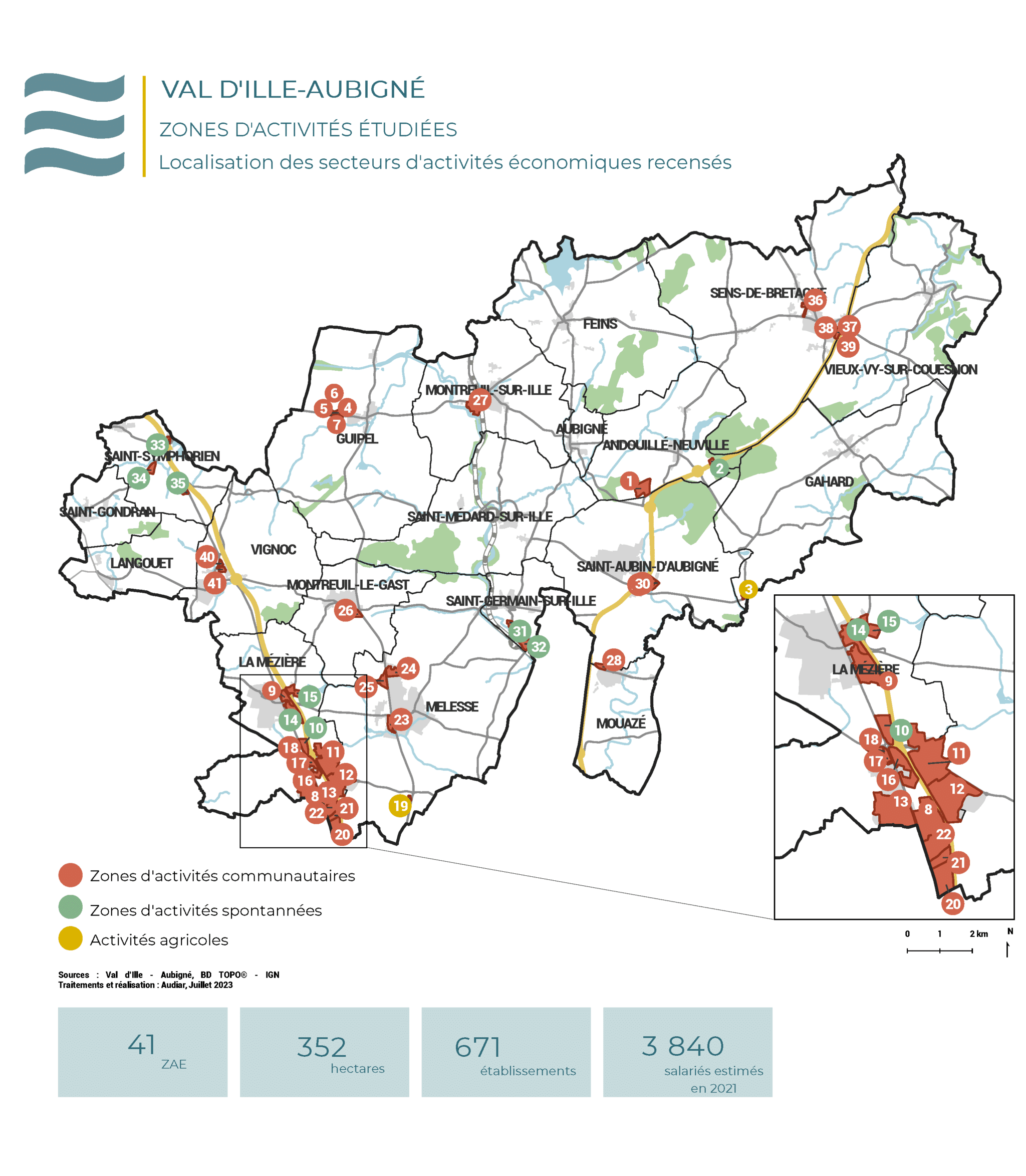 Cette étude portait sur 41 secteurs d’activités économiques correspondant en majeure partie au périmètre des zones d’activités. Ont également été pris en compte l’emprise des activités agricoles installées de manière isolée et les secteurs où des activités se sont implantées de manière spontanée.